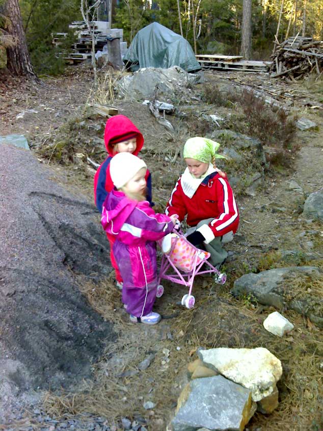 Lapset samaisena vappuna omissa puuhissaan: Lapset viihtyvät sitä paremmin mitä sekaisempi ympäristö on - löytyyhän sieltä niin paljon mielenkiintoista tutkittavaa. Vähän tosin harmittaa kun nukke ei sepelillä ajettaessa oikein meinaa pysyä kyydissä, mutta onneksi isommat lapset vähän jeesaavat. Vasemmalla kivituhkakasa kiveytysten tekoa varten ja taustalla sirkkeli peitettynä lavakasojen keskellä.