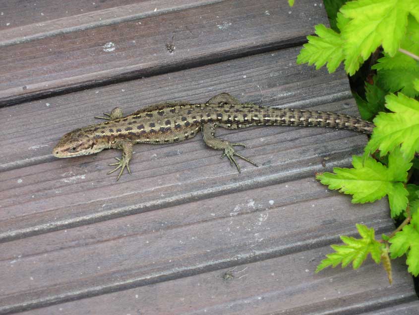 Sisilisko: Lisääntynyt kasivillisuus on tuonut pihaamme runsaasti hyönteisiä, jotka puolestaan houkuttelevat hyönteissyöjät paikalle. Sisiliskot pitävät hyönteisten lisäksi paljon myös lämmittävistä muureista ja kiveyksistä, ja kuten tässä kuvassa, myös tummista puurapuista jotka helteellä polttavat jalan alla. Sisiliskot tottuvat ihmiseen niin, että ne eivät lähde karkuun vaikka kävelet rappuja aivan sen vierestä.