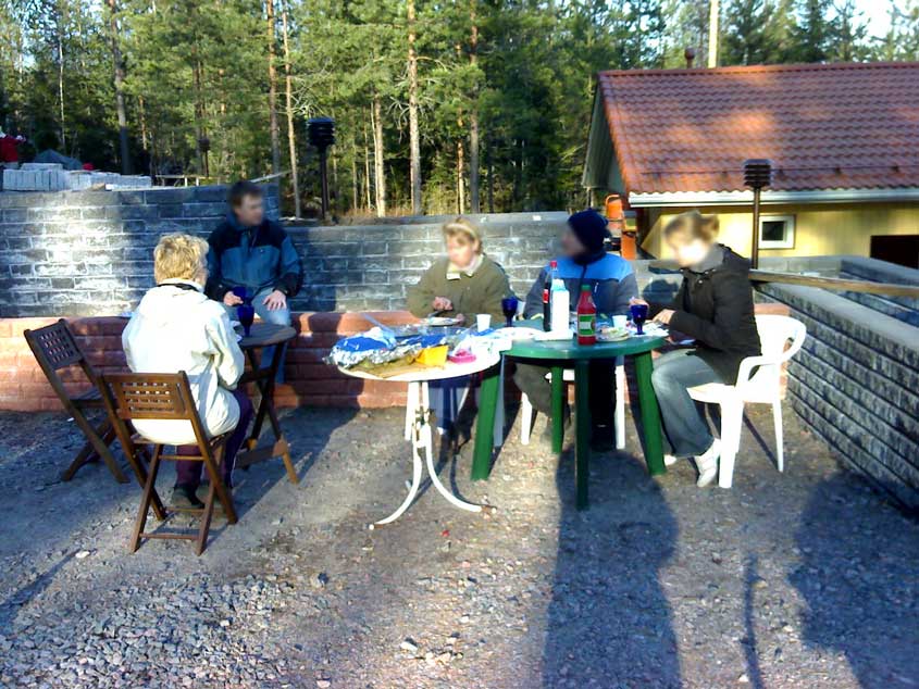 Vappuaaton illallinen 2006: Keskeneräisten istutusaltaiden keskellä ei haitannut vaikka sää oli kolean keväinen, sillä ruoka oli hyvää. Sekä ruoka että takapuoli tuppasivat jäähtymään vähän liikaa, mutta kun oli viimeinkin se oma piha jossa syödä ulkona. Patiolta puuttuu vielä kiveys ja istutusaltaat odottavat multaa ja kasveja.