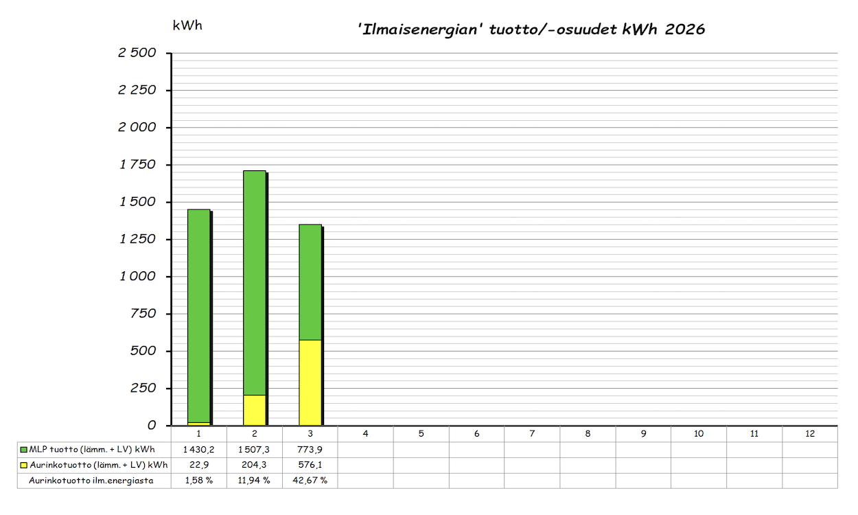 Vuoden ylempi pylväsdiagrammi näyttää kuukausittaisen 'ilmaisenergian' tuoton ja aurinkotuoton prosenttiosuuden tuotetusta ilmaisenergiasta. Alempi pylväsdiagrammi taas MLP kulutuksen, tuoton lämmitykseen ja LV esilämmitykseen sekä kuukauden aurinkolämpötuoton. Pylvään yläpuolella oleva piste on kuukauden COP arvo. Lämmitettävää tilaa on 143m2 + 60m2 kahdessa kerroksessa.