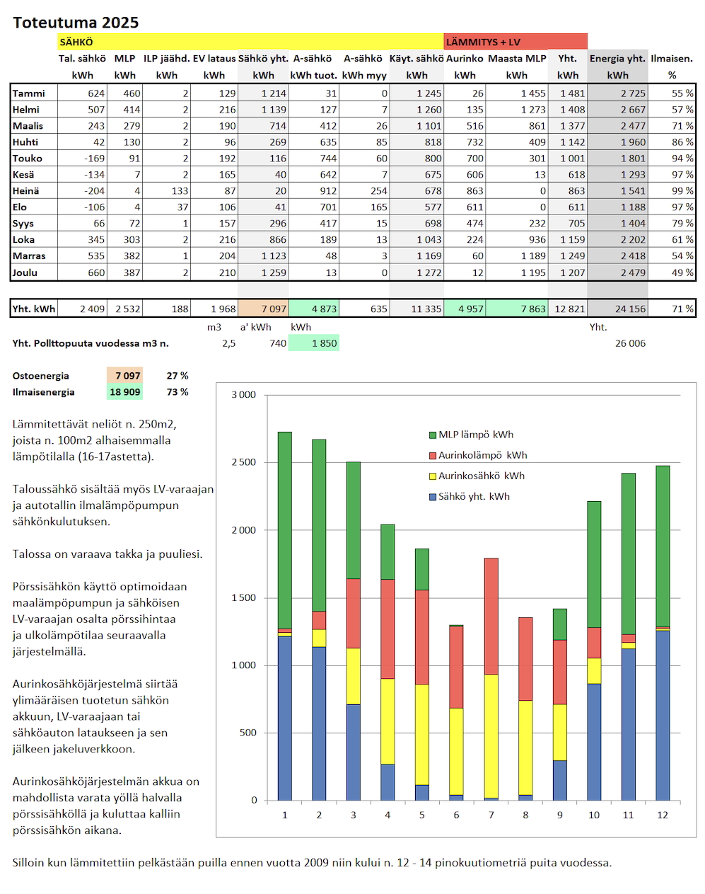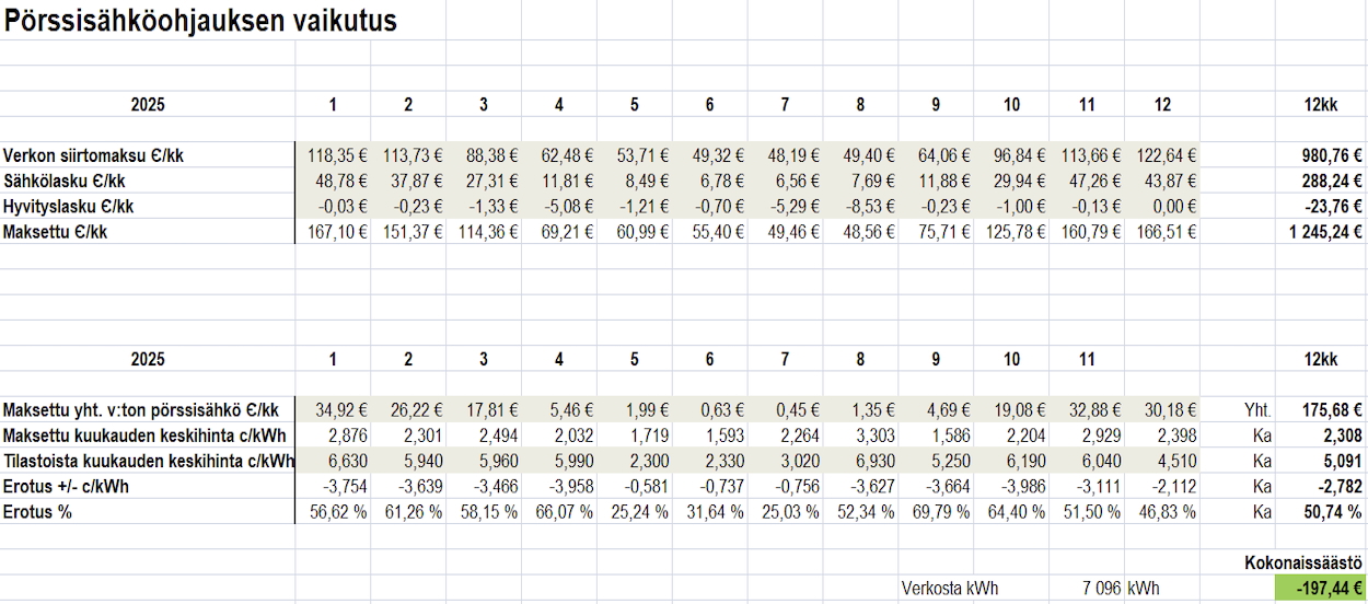 Sähkönkäytön ja - tuoton vuosittainen yhteenveto antaa käsityksen järjestelmien toimivuudesta ja vuosittaisesta vaihtelusta. Pörssisähköohjauksen hyödystä antaa taas kuvan se kuinka paljon alle pörssisähkön kuukausittaisen keskihinnan alle saadaan meidän maksama kuukausittainen pörssisähkön hinta.