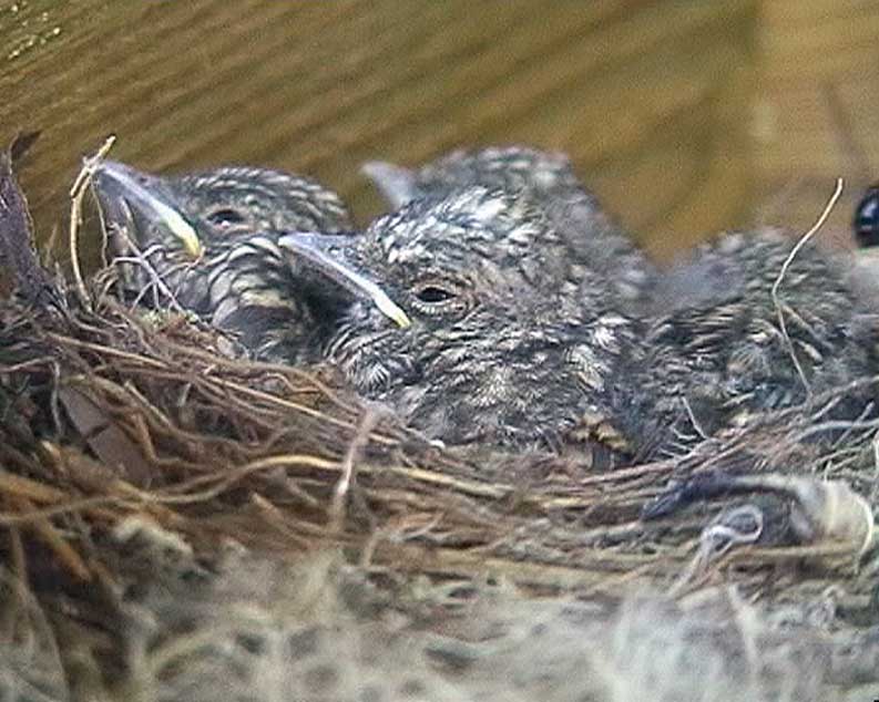 Harmaasiepon pesä: Ensimmäisiä meistä ilahtuneita eläinvieraita on harmaasieppo, joka teki pesän jo 2004 juuri valmistuneiden sisäänkäynnin rappusten tukipylvään päälle. Tässä kuvassa kenties sama emo on palannut paikalle, ja vuoden 2005 pesue valmistuu jo pikavauhtia lentokuntoon.