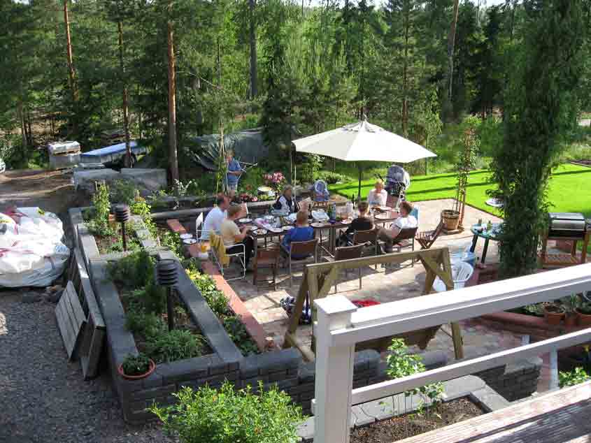 Juhannusjuhlat 2006: Pation kiveys valmistui kesäkuun alussa, joten juhannusta juhlittiin omssa pihassa yhdessä tuttujen kanssa. Sää oli tyypillisen viileä mutta aurinkoinen, ja keväällä hankittu grilli toimi hyvin, joten mukavaa oli. Muurikivistä rakennetut istutusaltaat on eristetty ja täytetty, sekä istutukset tehty.