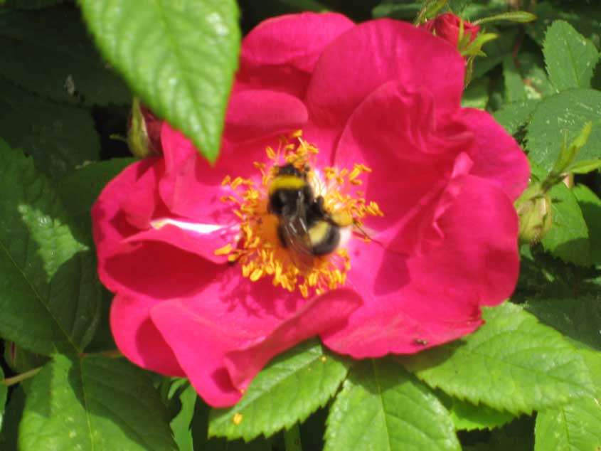 Kimalainen Valamonruusussa: Pölyttäjät löytävät heti uusille apajille, sillä tämä kukka houkuttelee varmasti sekä ulkonäöllään, että huumaavan hyvällä tuoksullaan. Ahkera surina tahdittaa mukavasti työntekoa kesäisellä pihamaalla.