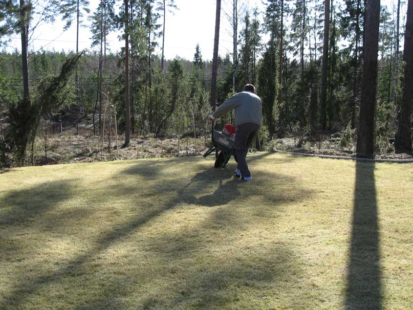 Ruohon leikkuussa: Ruoho aloitti vauhdikkaan kasvun, ja pääsimme tositoimiin. Koska nurmikkoa on vain n. 130 neliötä, ja arvostamme hiljaisuutta ja rauhallista asuinympäristöä, hankimme työnnettävän mallin. Tämä on hyvä myös siksi, että se pakottaa haravoimaan niittojätteet ja puista pudonneet havunneulaset pois. Siirtonurmikko, siinä missä kylvettykin, tykkää haravoinnista.