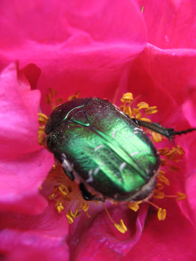 Kultakuoriainen: Kaiken näköisiä koppakuoriaisia pörisee kukissa ja heinikossa. Tämä yksilö on lennähtänyt ruokailemaan Valamonruusuun, mutta asuinpaikasta ei ole tietoakaan. Mustien koppakuoriaisten olemme sen sijaan havainneet kaivavan hyviä ilmastuskoloja nurmikolle - lieneeköhän pitkiäkin käytäviä.