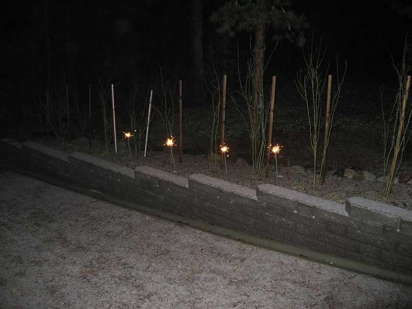 Lumeton Uusi Vuosi: Uuden vuoden 2008 vastaanotto sujui lumettomassa pihassa. Kuvassa tähtisadetikut valaisevat edellisenä kesänä istutettuja Siperianherne-pensaita. Tässä vaiheessa talvea jäätynyttä maata peitti vain ohut kuurapinta, mutta onneksi lämpotilatkin pysyivät lähellä nollaa.
