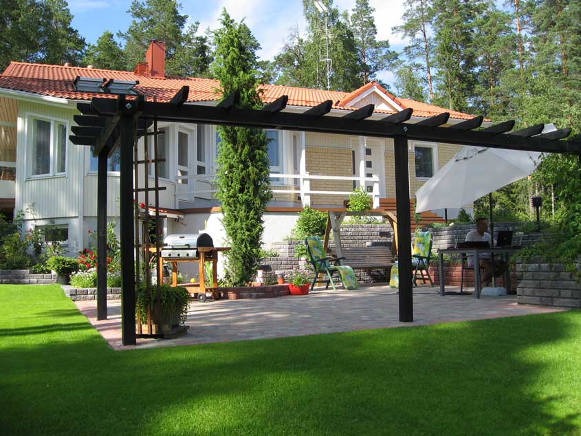 Tanssia kiveyksellä: Kesällä 2007 pystytimme pihaan juhlia varten teltan. Huolimatta pergolan tuomista hankaluuksista, onnistuimme pystyttämään mukavan teltan juhlia varten. Sitä paitsi teltan sisään jäänyt pergolan osa loi telttaan aivan omanlaisensa tunnelman. Pation kiveys ei ole ainakaan luiston puolesta ihanteellinen tanssilattia, mutta pystyi siinä kuitenkin vähän pyörähtelemään.