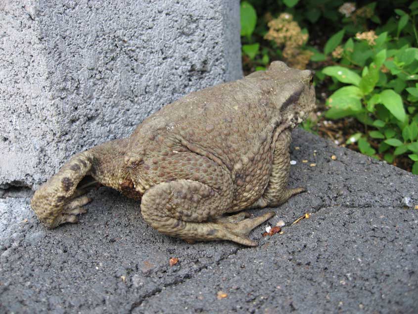 Rupikonna takaa: Ja tietysti ruuan runsaus houkuttelee ketä tahansa. Ilmeisesti sammakkoeläimet eivät ole moksiskaan muurahaisista, paitsi jos syövät myös niitä, joista pihalla ei pääse millään keinoin kokonaan eroon. Sorapihalta yllätetty konna kiirehtii takaisin pensaiden suojaan katseilta piiloon.