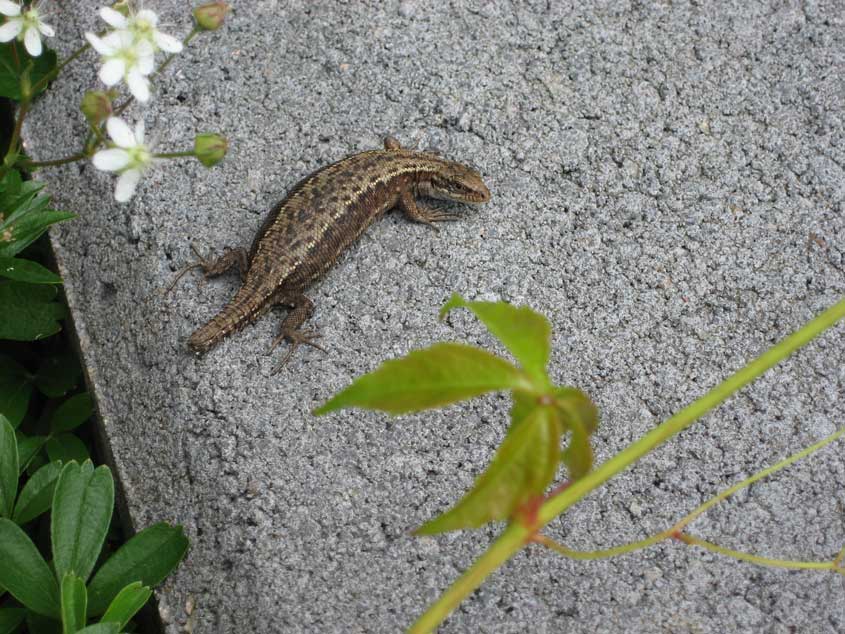 Sisilisko: Lisääntynyt kasivillisuus on tuonut pihaamme runsaasti hyönteisiä, jotka puolestaan houkuttelevat hyönteissyöjät paikalle. Sisiliskot pitävät hyönteisten lisäksi paljon myös lämmittävistä muureista ja kiveyksistä, ja kuten tässä kuvassa, myös tummista puurapuista jotka helteellä polttavat jalan alla. Sisiliskot tottuvat ihmiseen niin, että ne eivät lähde karkuun vaikka kävelet rappuja aivan sen vierestä.