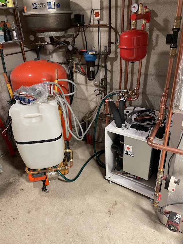 Putkitusta 4.11.2021 Maalämpöpumpun paluupiiriä pääsi heti putkittamaan mutta menopiiri oli jonkun aikaa kesken koska vaihtoventtiili oli epähuomiossa jäänyt tilaamatta. Koska tarkoitus on täydentää meidän kotisivuilla olevan aurinkojärjestelmän tilannekaaviota maalämmön tiedoilla niin putkistoon tuli lisäkomponentteina pari virtausmittaria ja lämpötila-anturia. Seurannasta enemmän seuraavalla välilehdellä.
