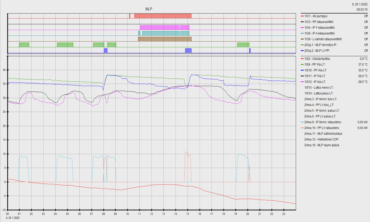 Lokakuussa 2022 aloitimme valmistelut tulevaan SPOT -sähkösopimukseen rakentamalla Raspberry Pi pohjaisen ohjausjärjestelmän, joka ohjaa maalämpöpumppua käymään yön edullisimmilla tunneilla. Koska puskurivaraajaa ladataan korkeampaan lämpötilaan kuin aikaisemmin niin COP hieman heikkenee.