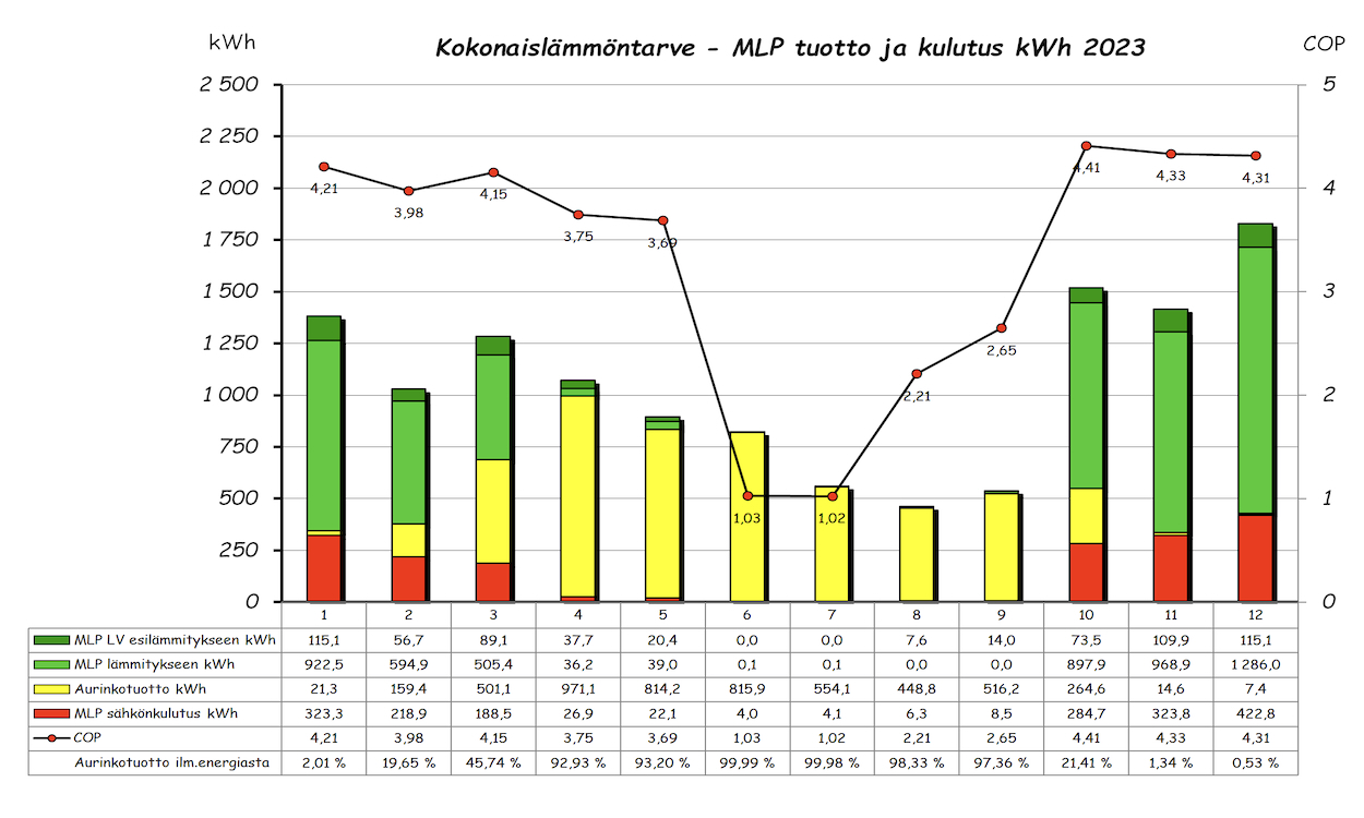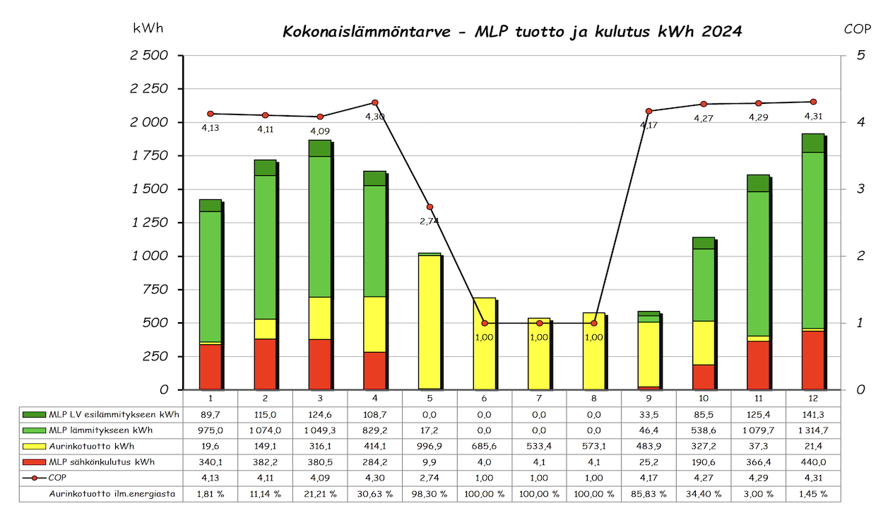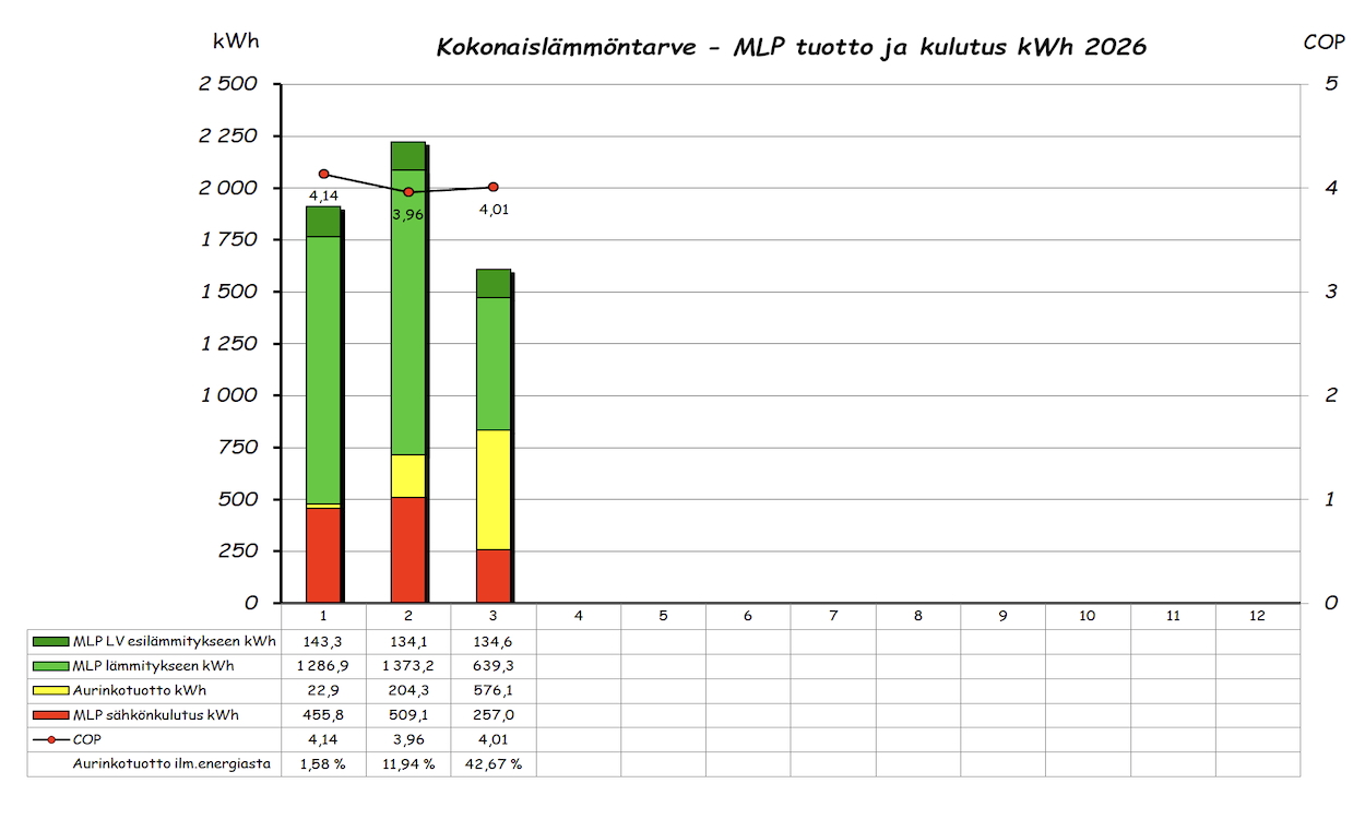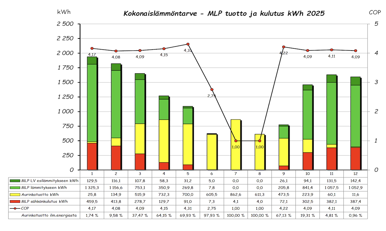 Vuoden ylempi pylväsdiagrammi näyttää kuukausittaisen 'ilmaisenergian' tuoton ja aurinkotuoton prosenttiosuuden tuotetusta ilmaisenergiasta. Alempi pylväsdiagrammi taas MLP kulutuksen, tuoton lämmitykseen ja LV esilämmitykseen sekä kuukauden aurinkolämpötuoton. Pylvään yläpuolella oleva piste on kuukauden COP arvo. Lämmitettävää tilaa on 143m2 + 60m2 kahdessa kerroksessa.