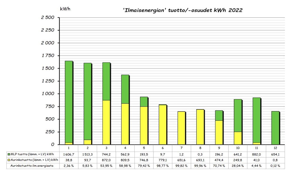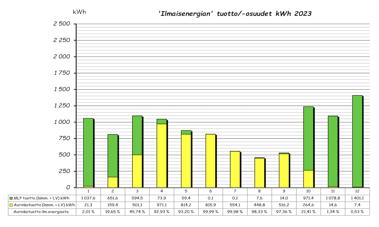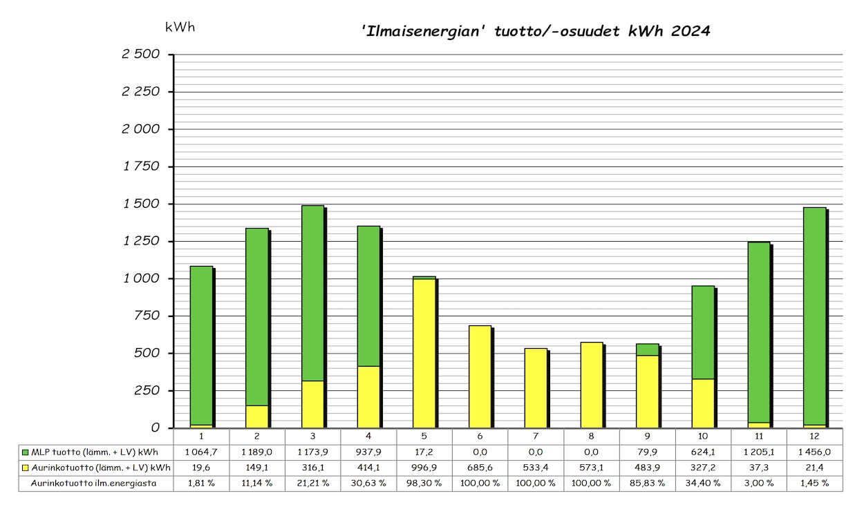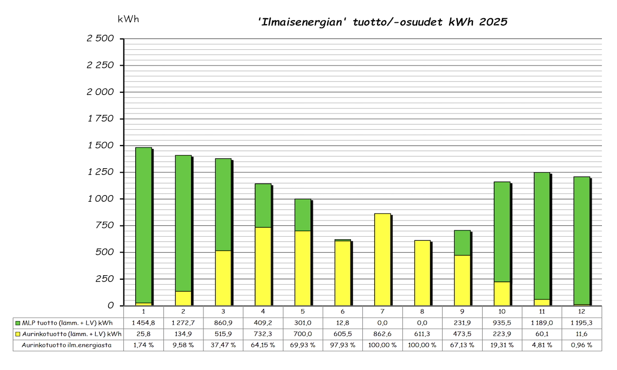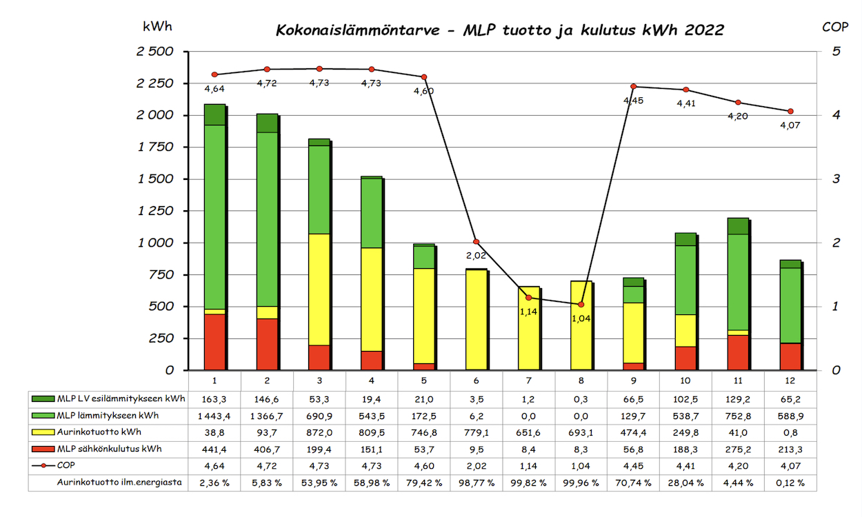 Vuoden ylempi pylväsdiagrammi näyttää kuukausittaisen 'ilmaisenergian' tuoton ja aurinkotuoton prosenttiosuuden tuotetusta ilmaisenergiasta. Alempi pylväsdiagrammi taas MLP kulutuksen, tuoton lämmitykseen ja LV esilämmitykseen sekä kuukauden aurinkolämpötuoton. Pylvään yläpuolella oleva piste on kuukauden COP arvo. Lämmitettävää tilaa on 143m2 + 60m2 kahdessa kerroksessa.